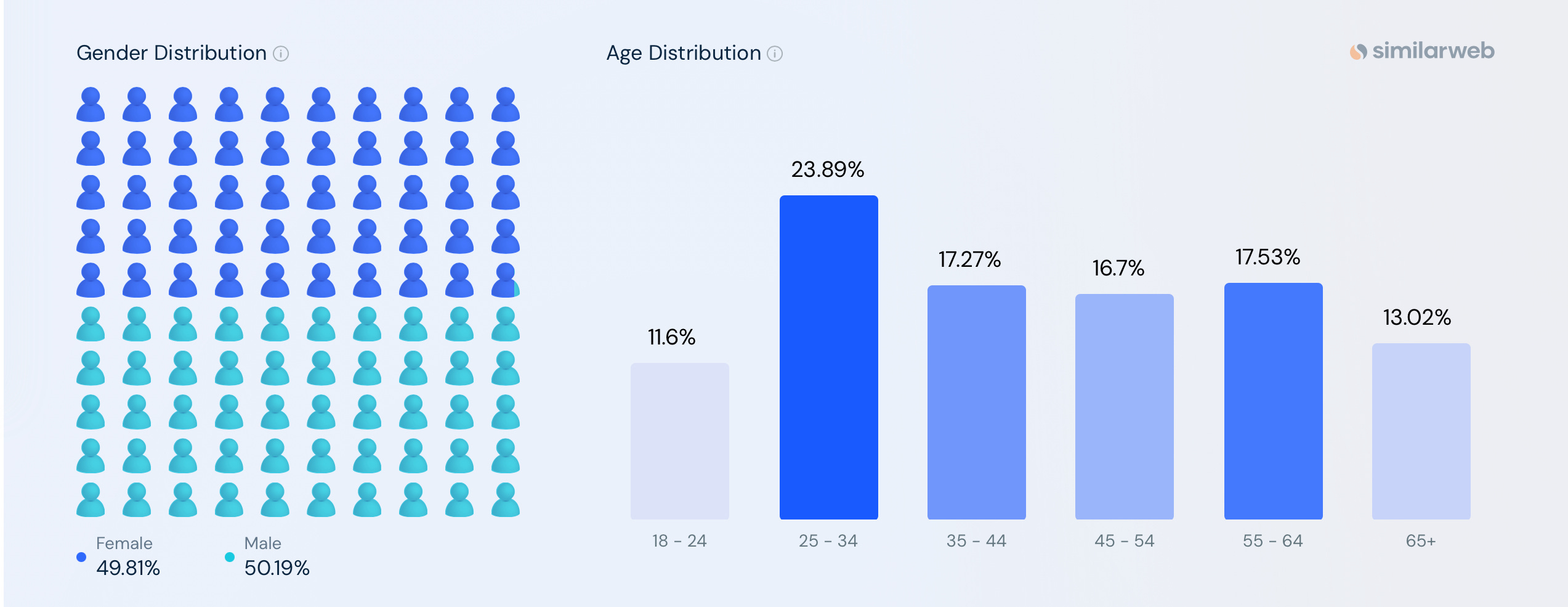 Fifty-five percent of Substack users are from the United States, followed by the United Kingdom (5.6%) and Canada (3.5%). Slightly more men (50.1%) than women (49.8%) use Substack. Most subscribers are between the ages of 25 - 34 (23.9%). Eighty-two percent of subscribers use Substack’s audio and video functions, which include listening to podcasts and viewing videos embedded in posts.